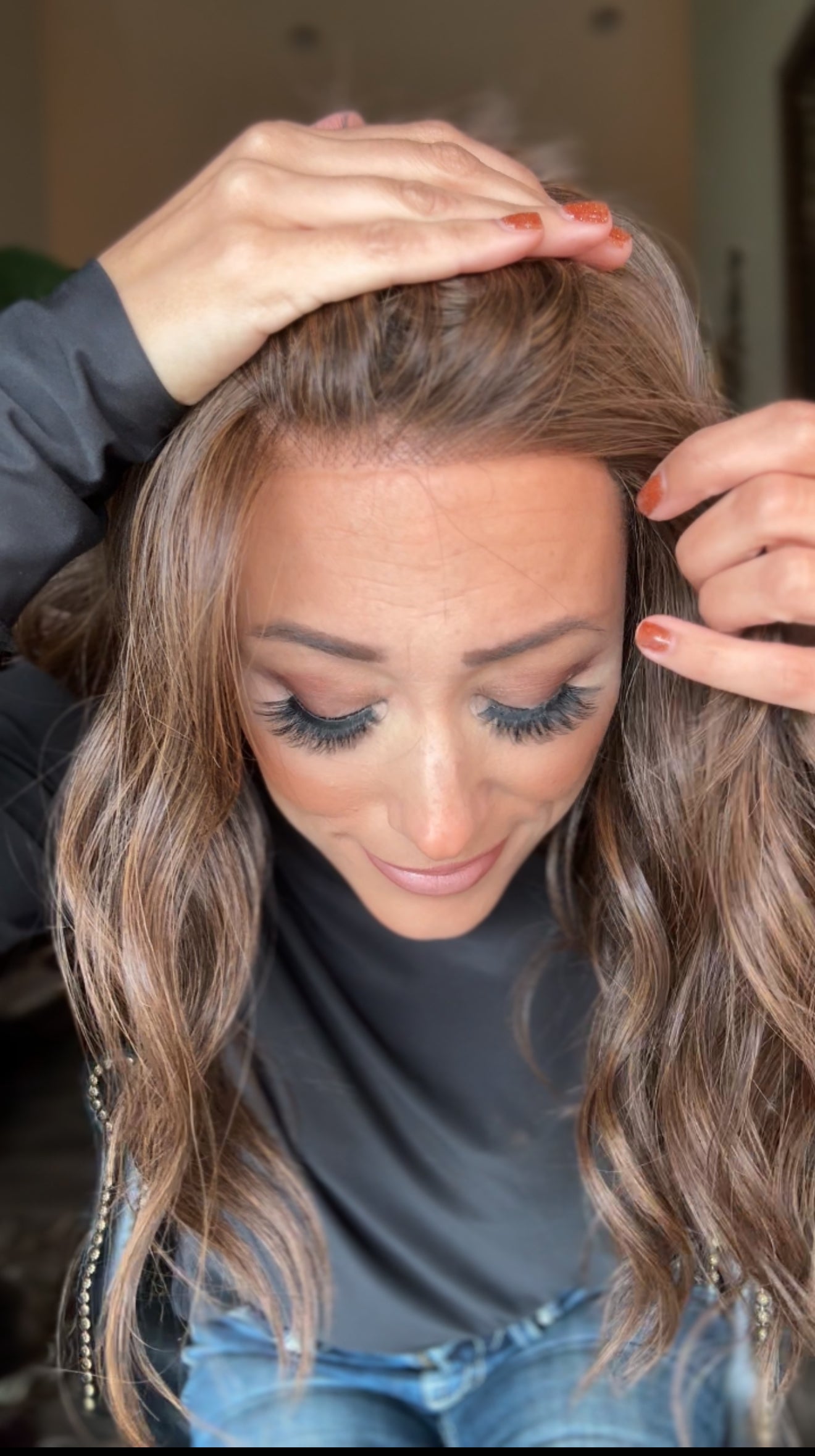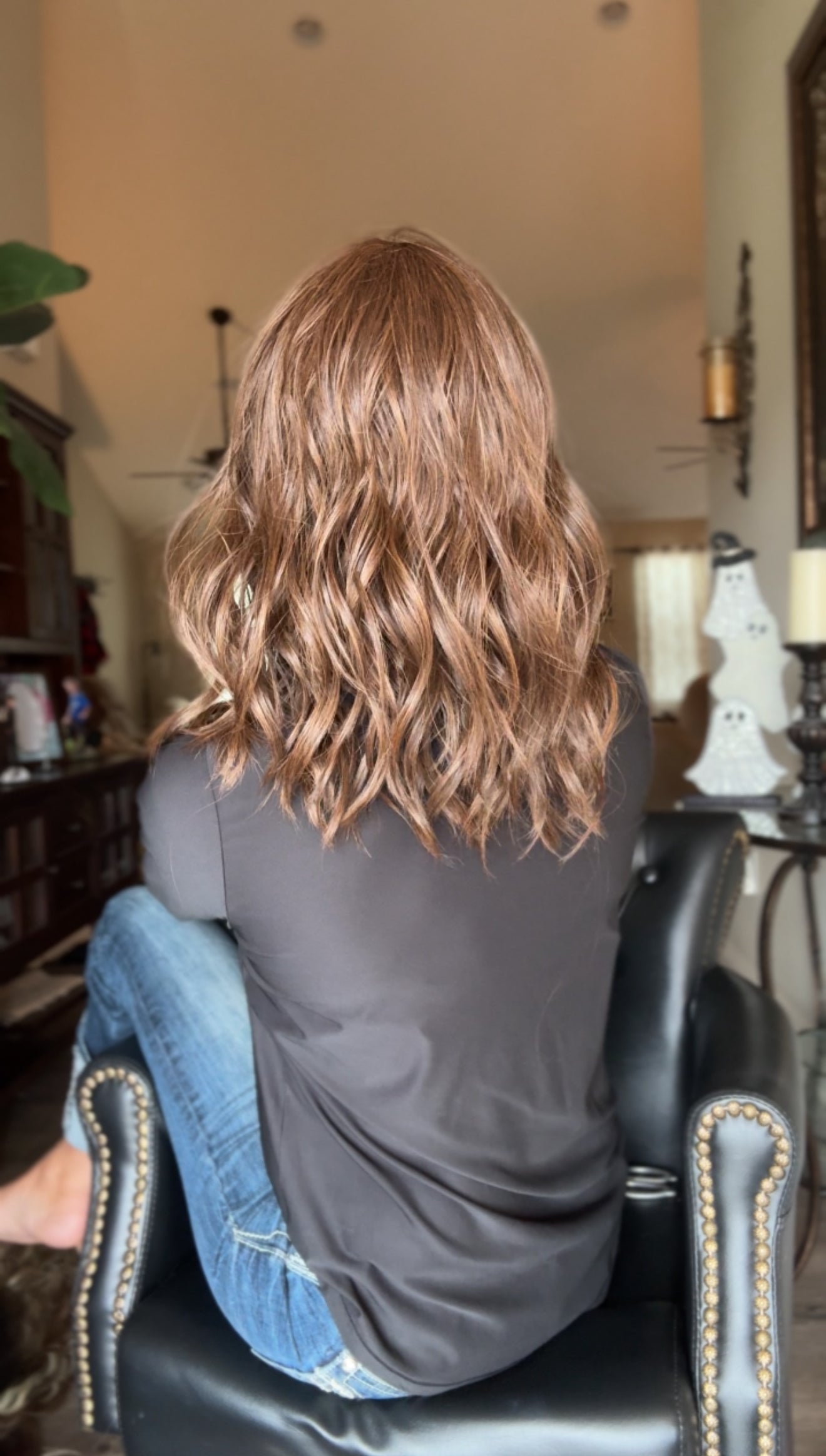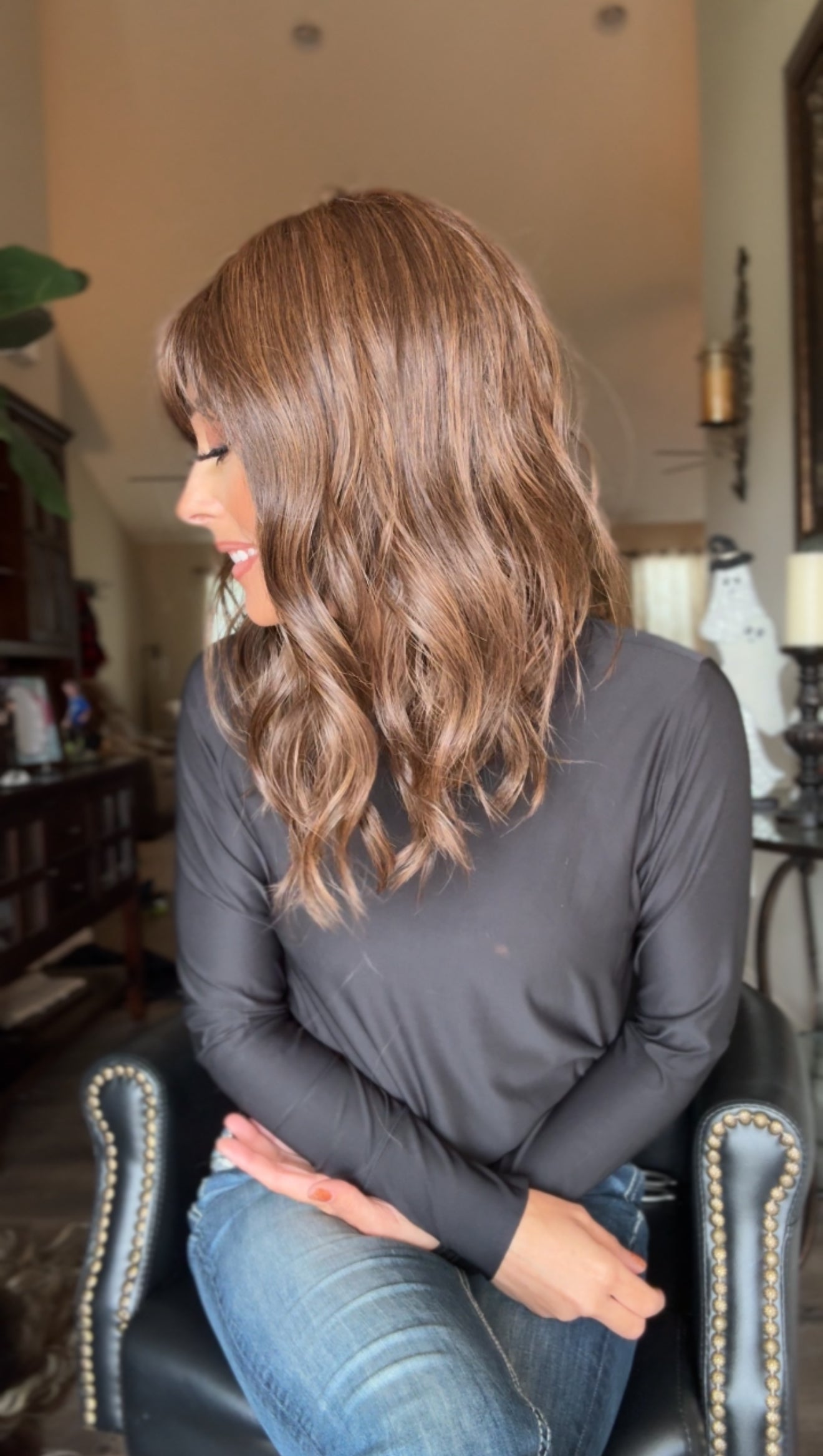 Angela Ready: Volume added, invisible layers, curtain bangs, heat combed.