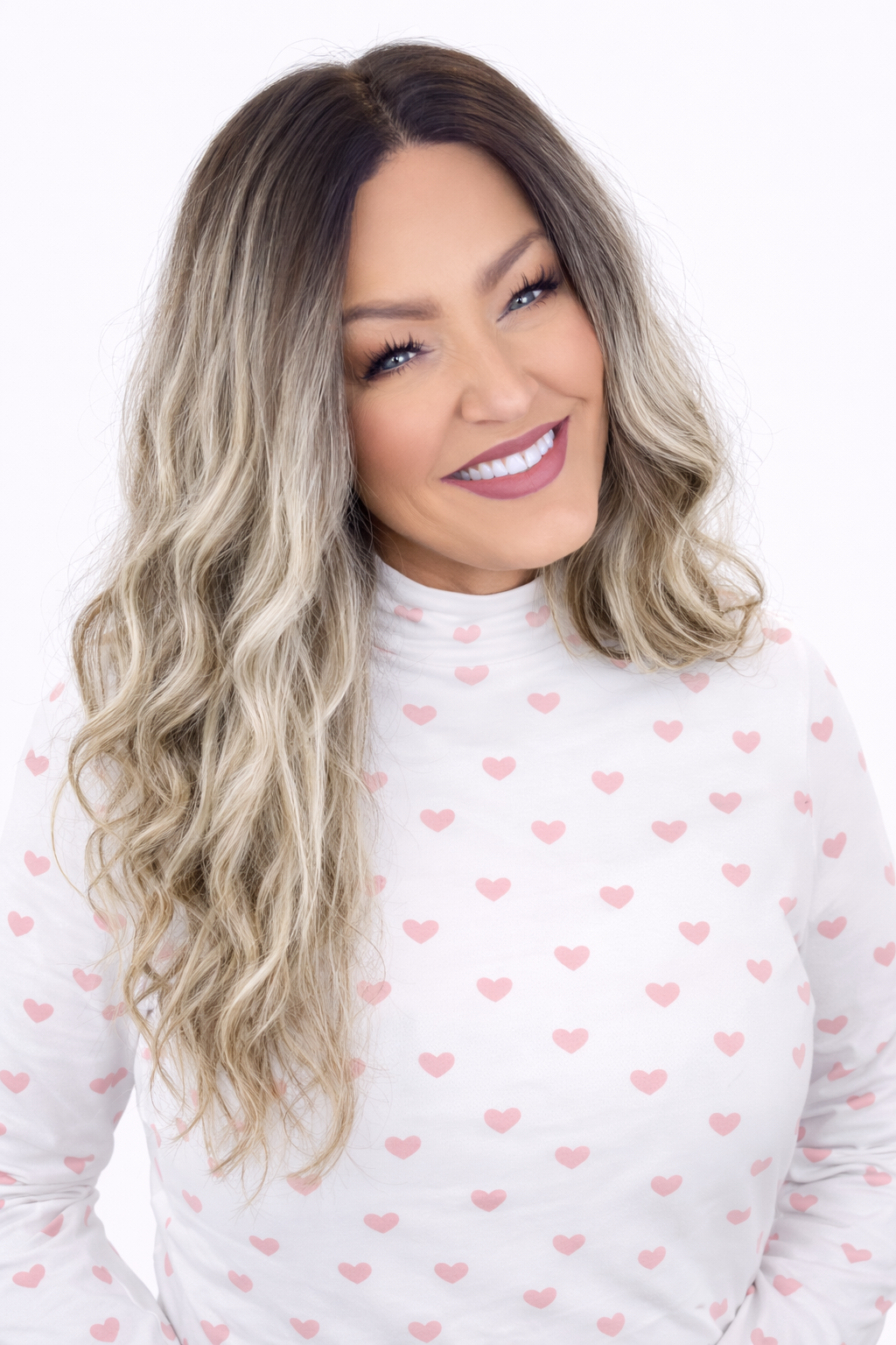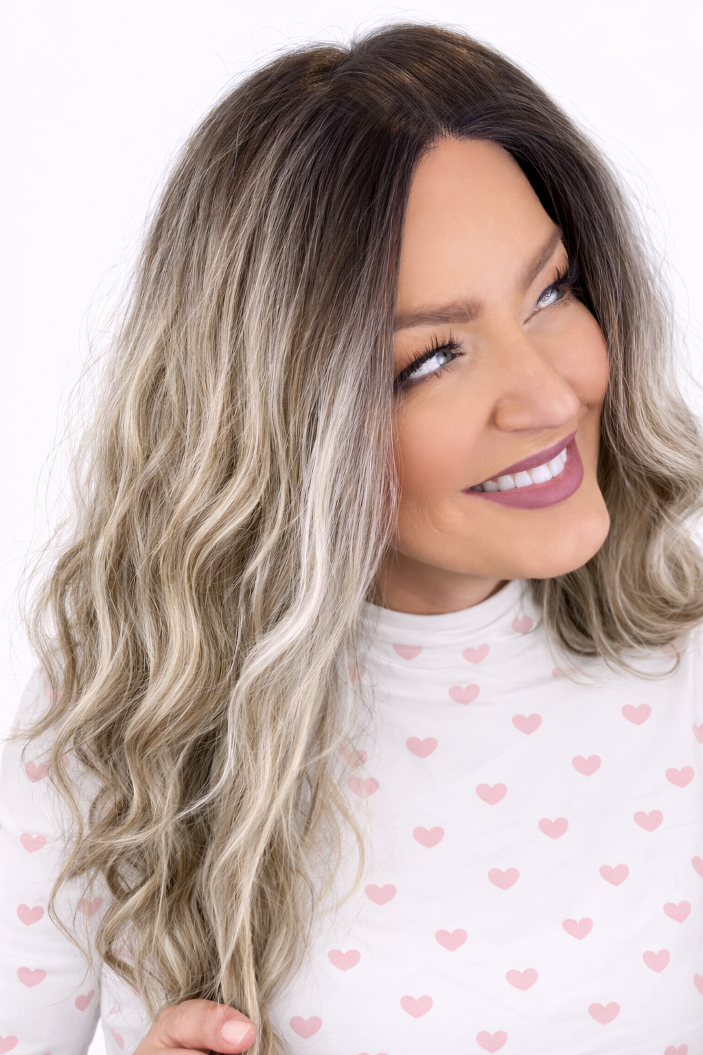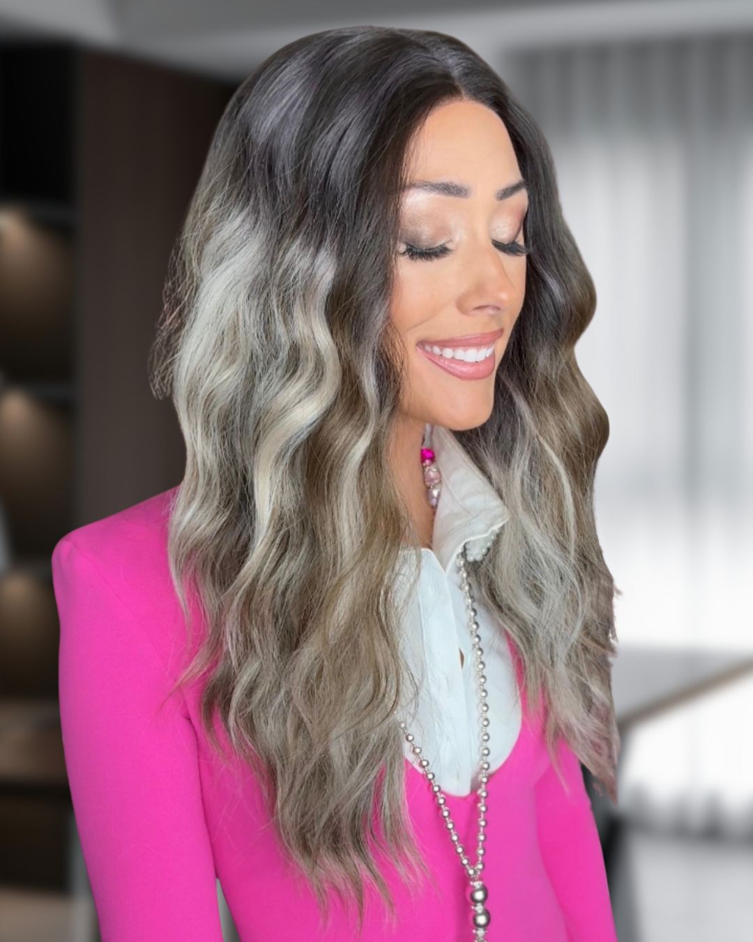 Dark ash brown roots with light blonde highlights, ash brown lowlights.