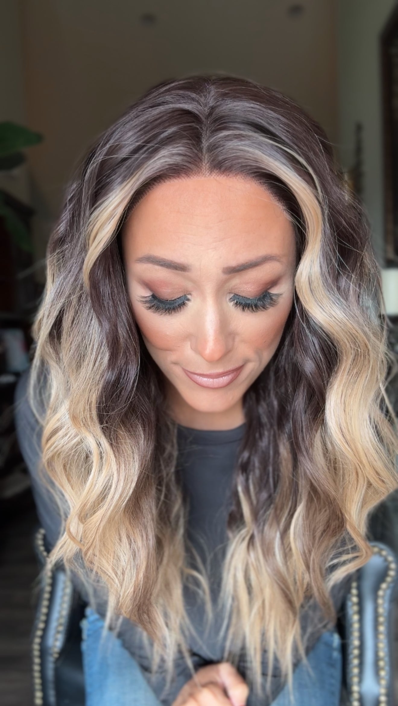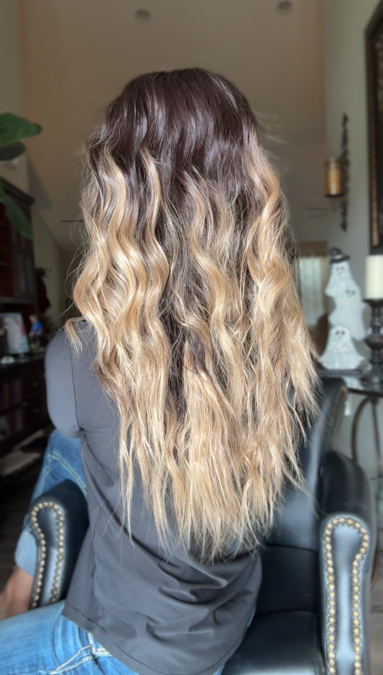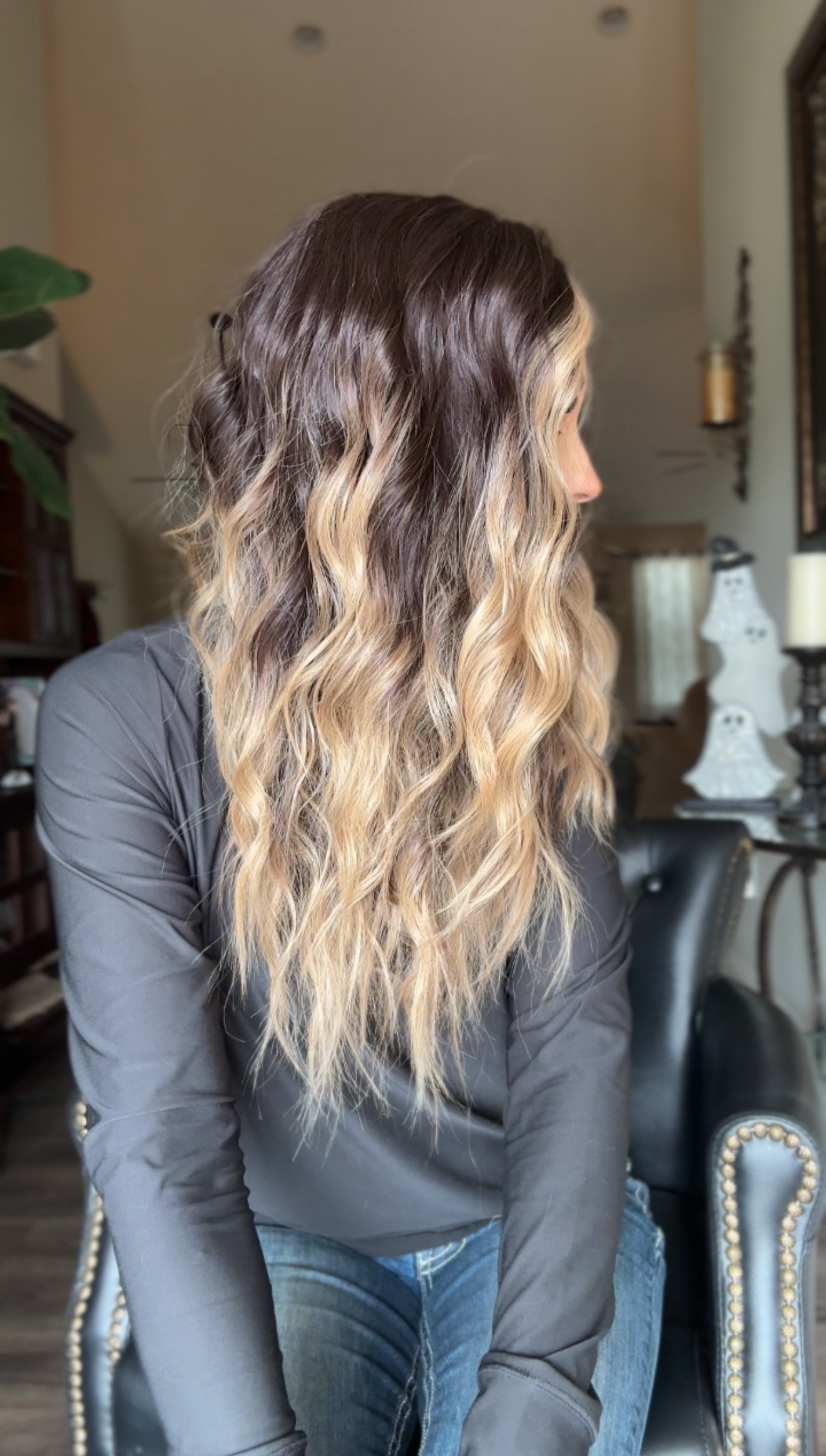 Darkest cool brunette to golden blonde ombre, with golden blonde money piece.