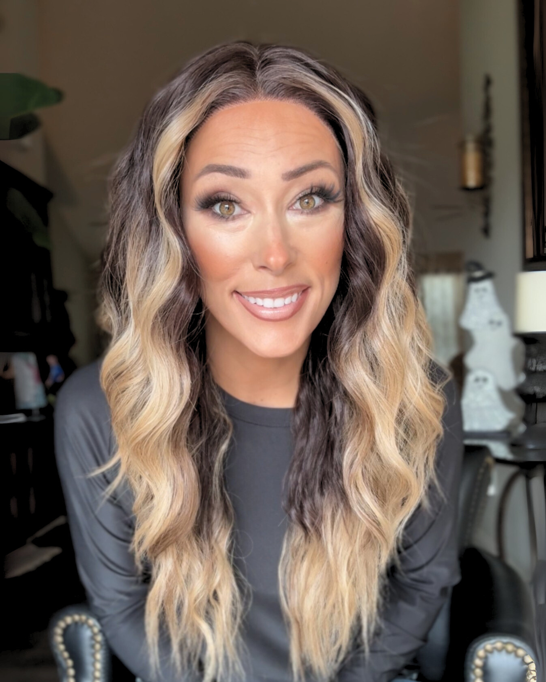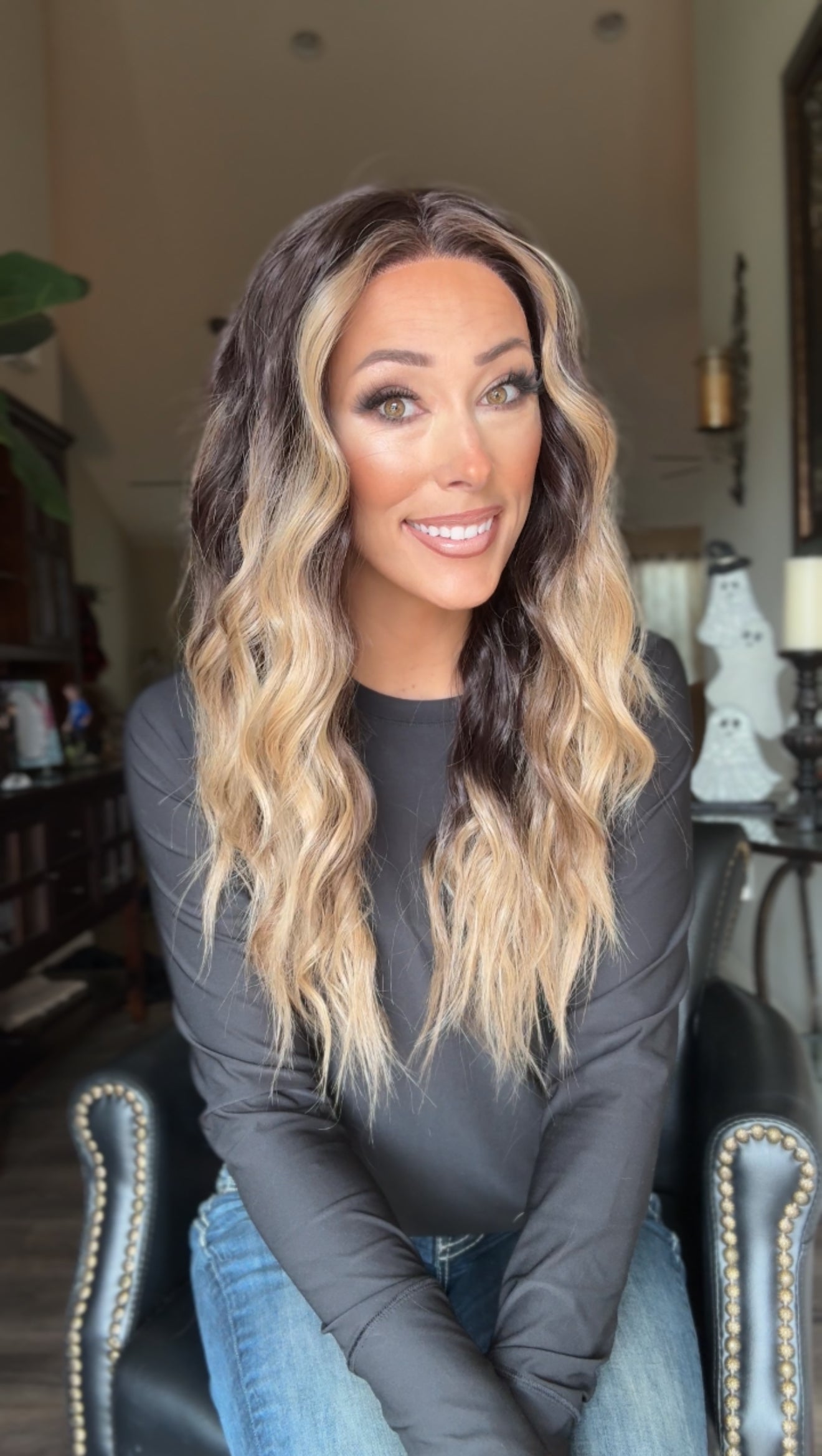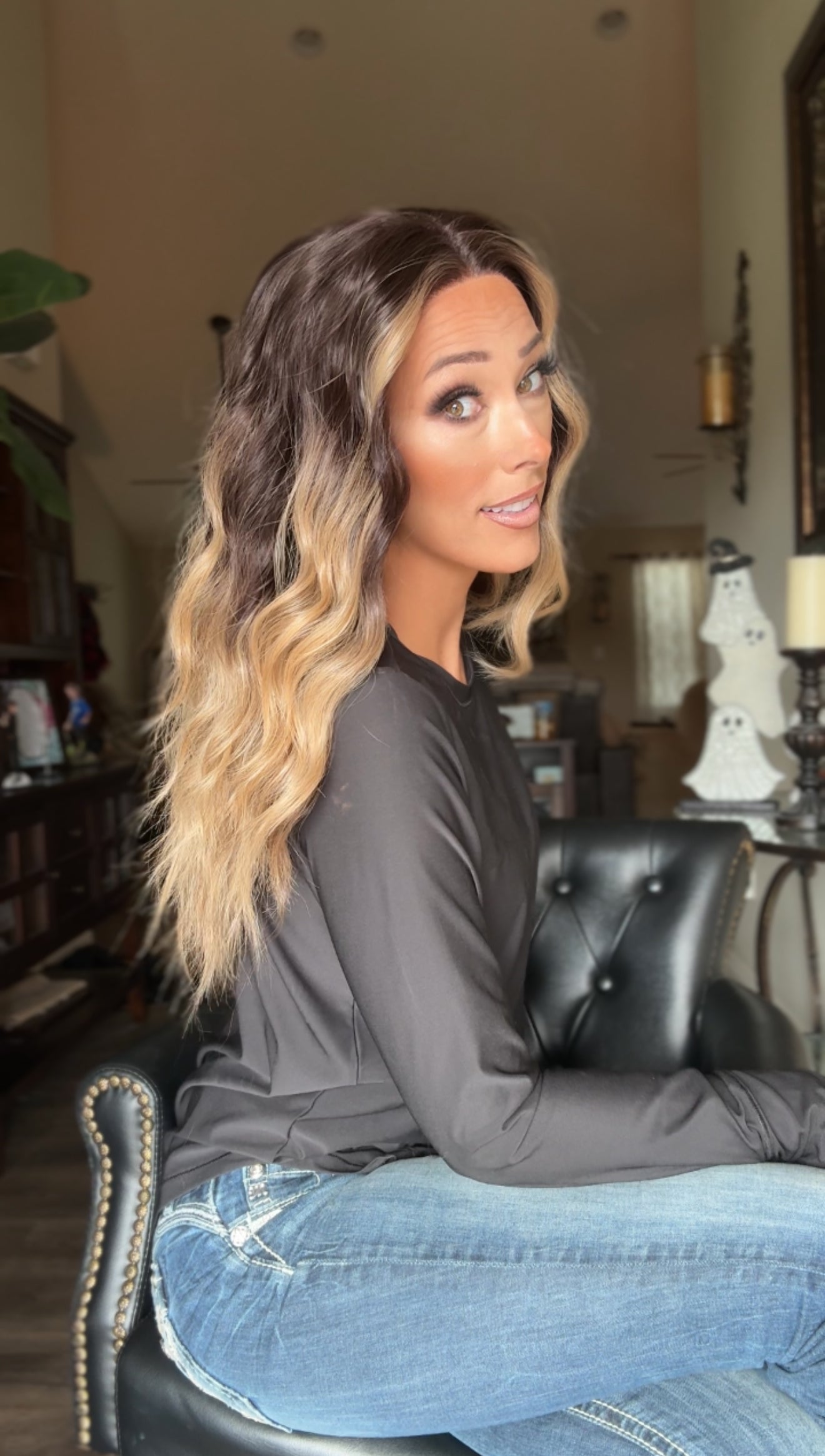 Darkest cool brunette to golden blonde ombre, with golden blonde money piece.