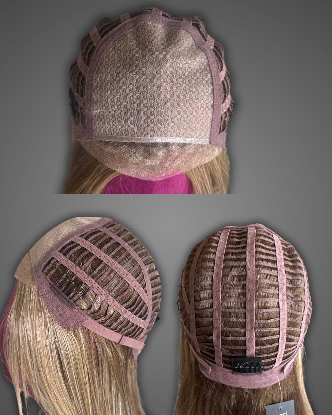 10 inch nape to ends free parting mono with 3 combs and velcro adjusters. Easy throw and go long layered shag with curtain bangs.