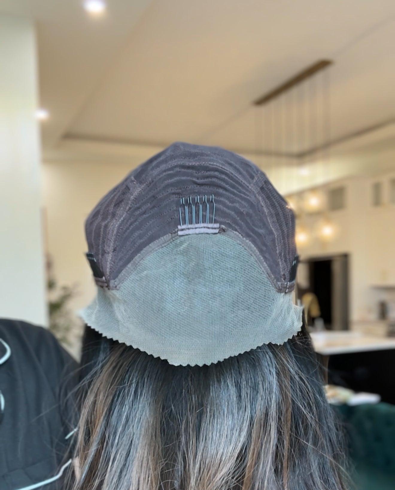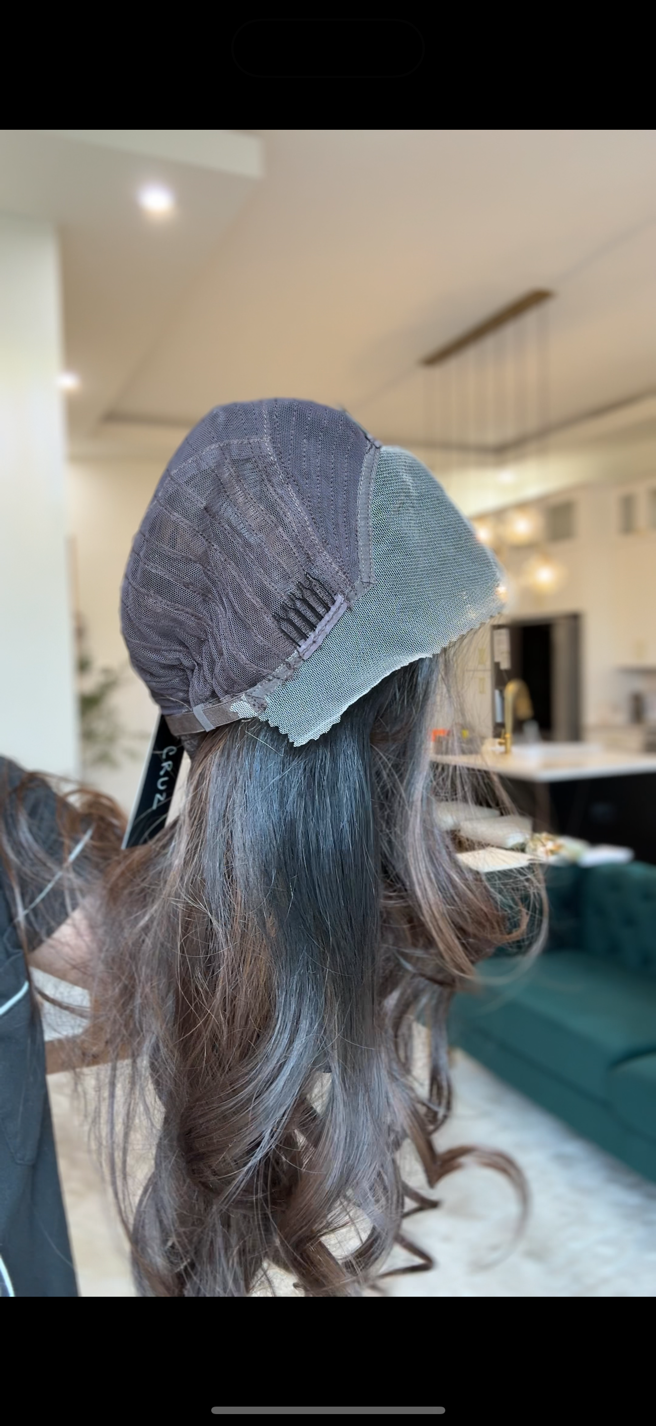 Cruz-level 4 brunette base with a caramel balayage- 22 inch Nape to Ends- 13x4 cap- Layered with curtain bangs-3 combs- Adjustable hooks