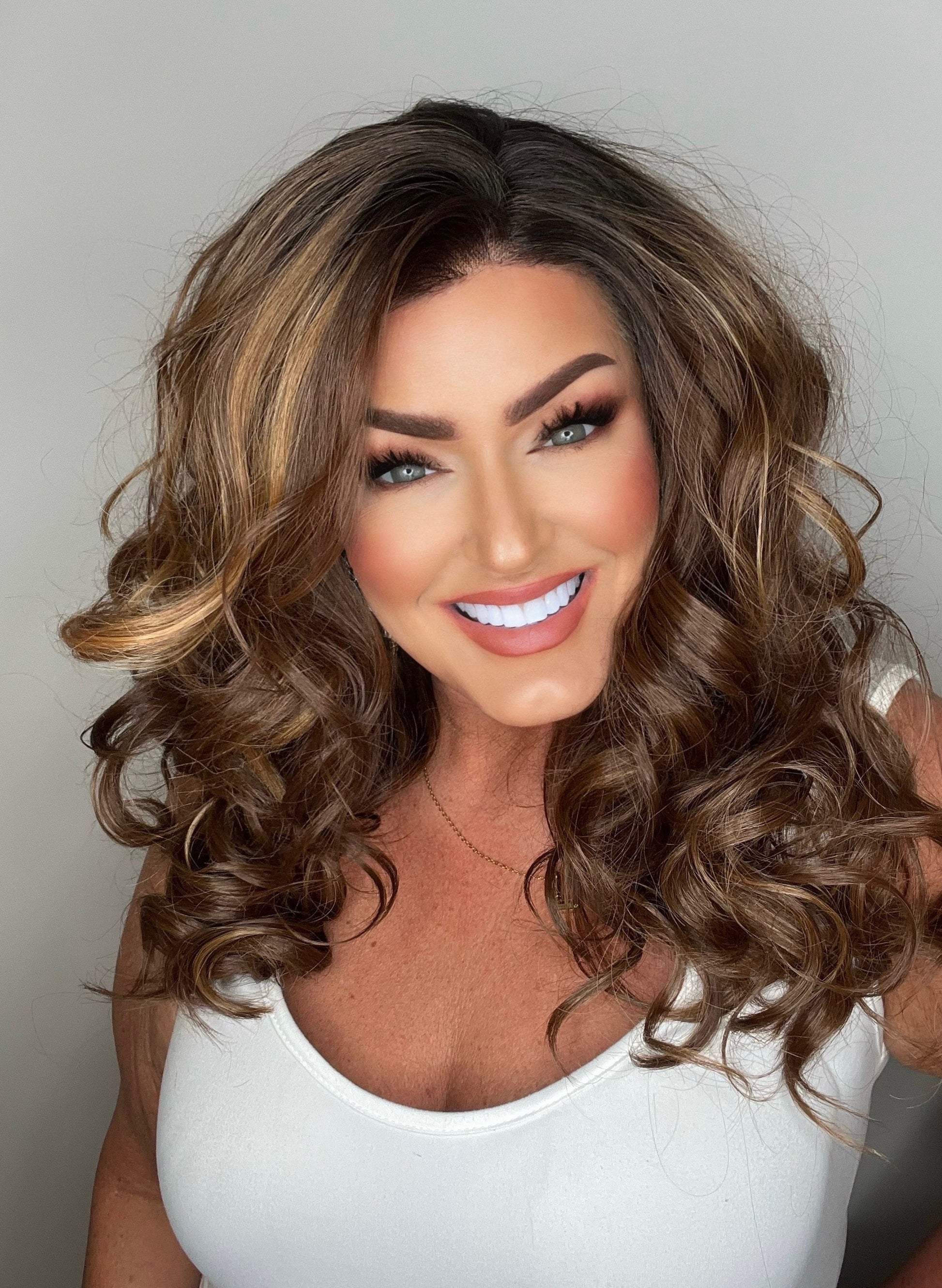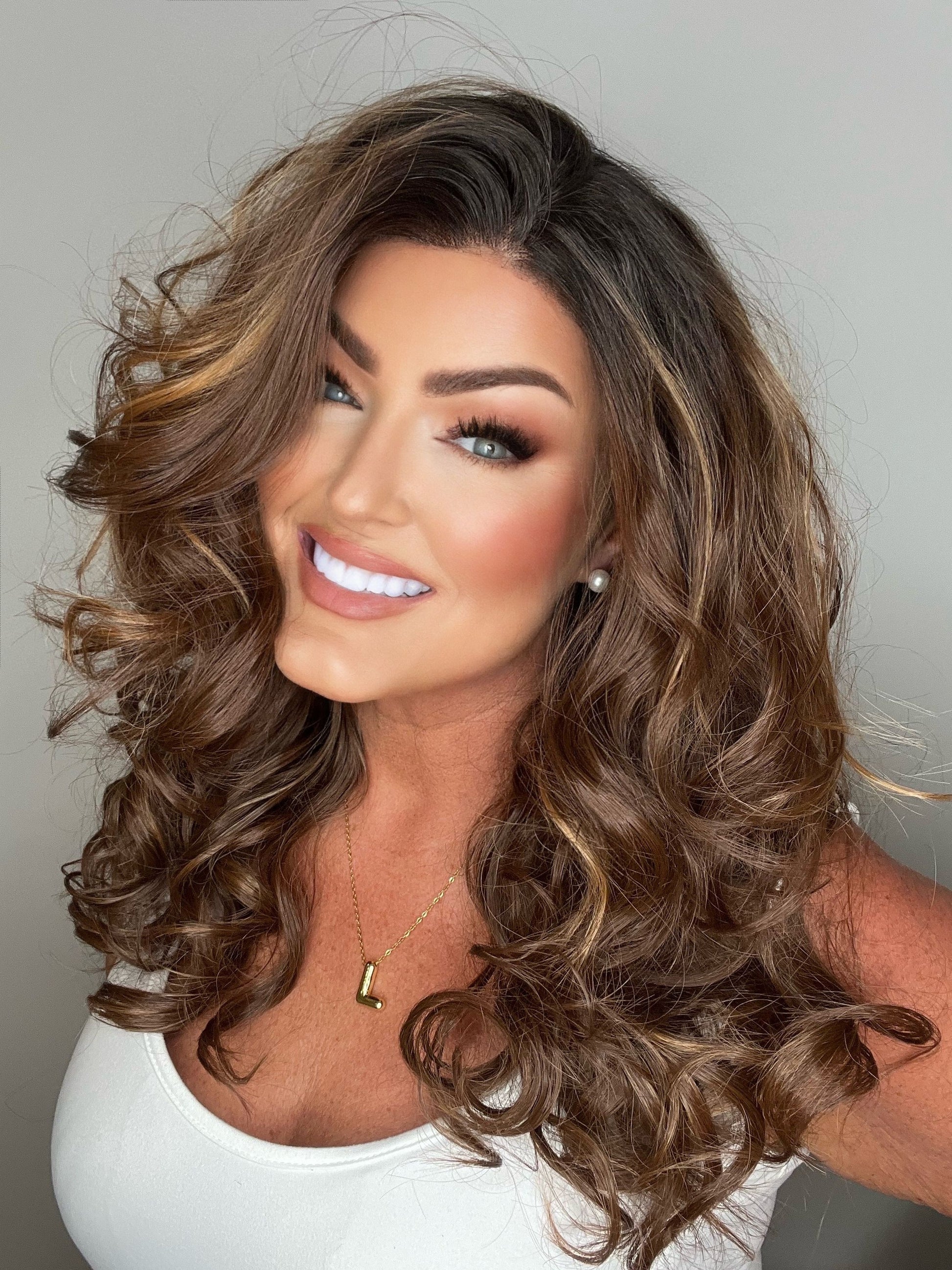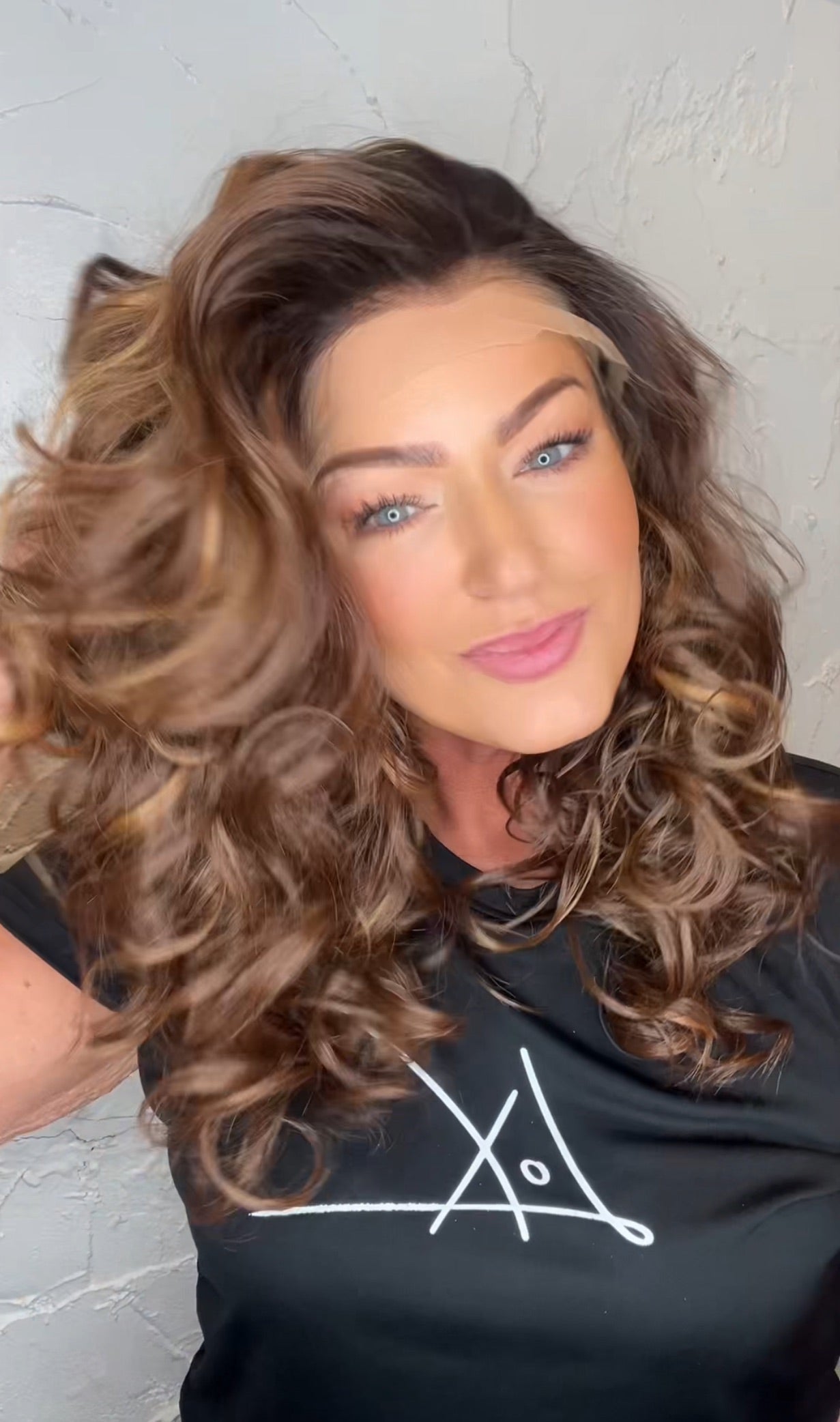 Experience a perfected look with our Dallas wig, styled by expert stylist Angela Emmons. The beautiful curly brunette with a darker root and 130% density adds natural volume and versatile parting.