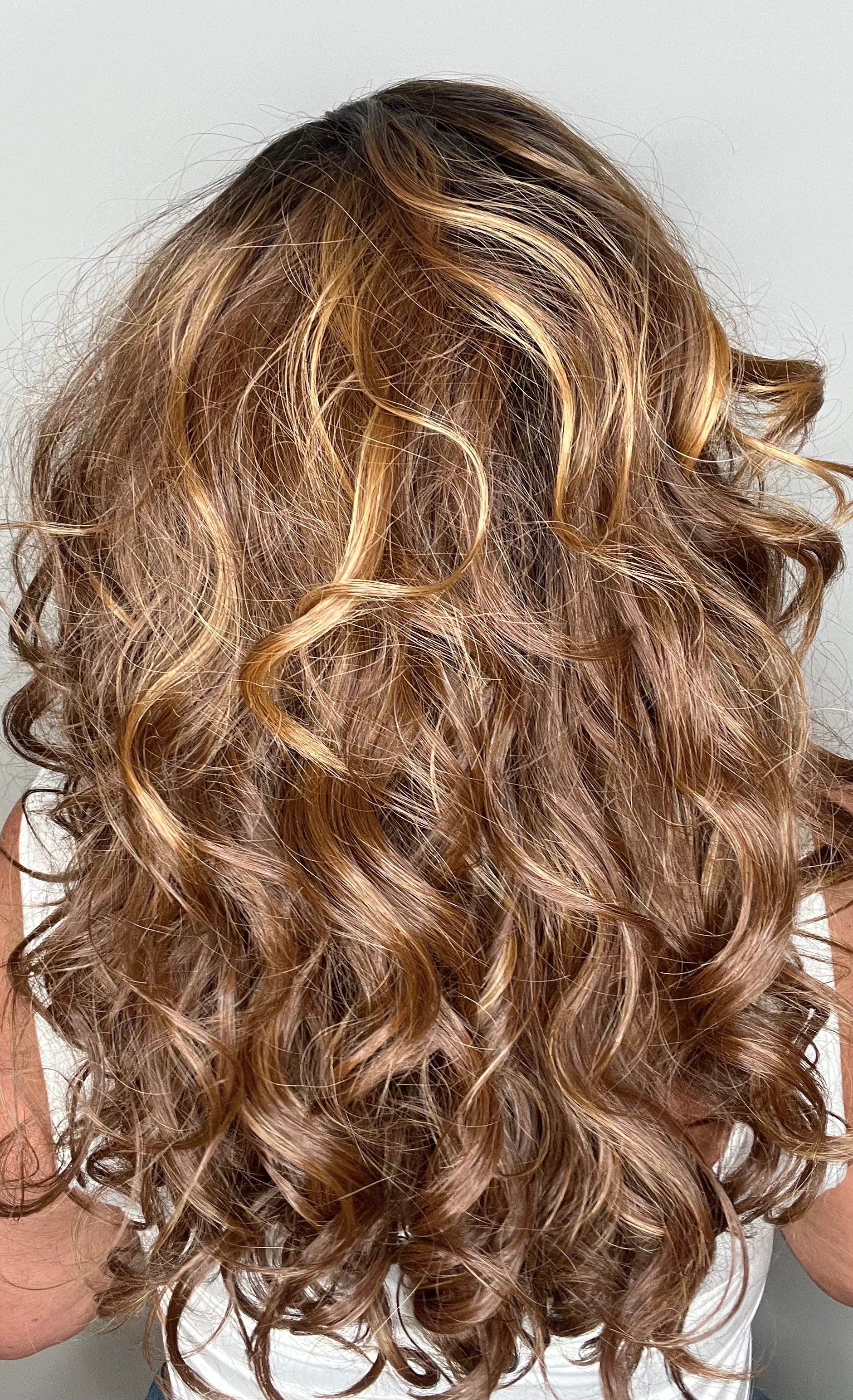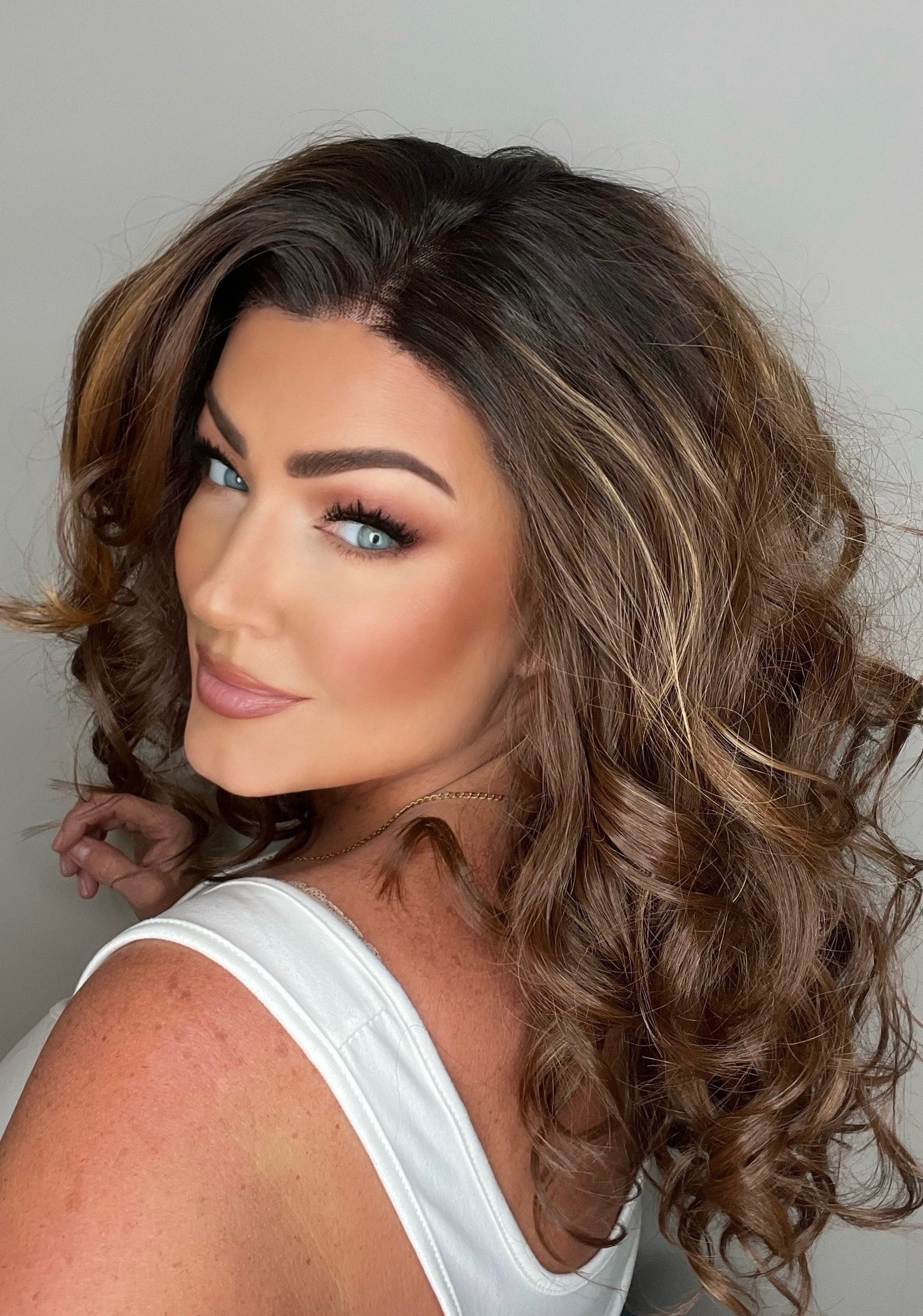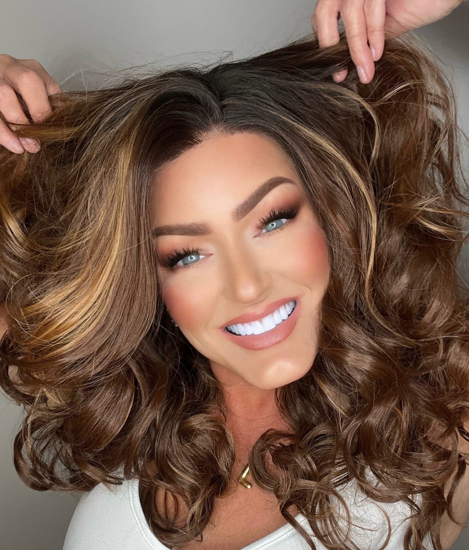Experience a perfected look with our Dallas wig, styled by expert stylist Angela Emmons. The beautiful curly brunette with a darker root and 130% density adds natural volume and versatile parting.