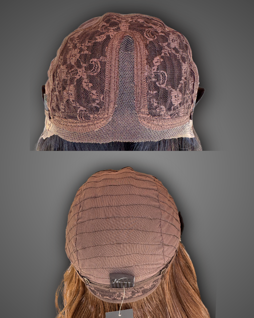 ULTRA PETITE CAP FOR OUR PETITE QUEENS. shaggy loose curl our take of a medium length butterfly cut with wispy bang. lace front Tpart