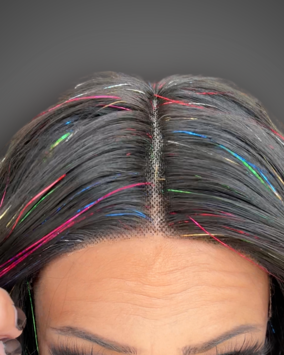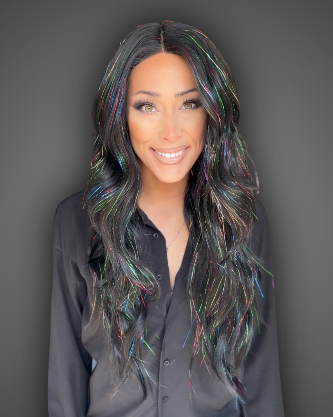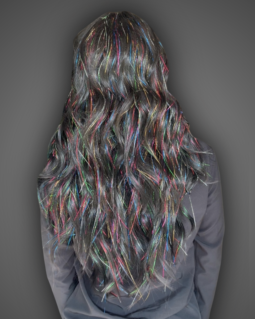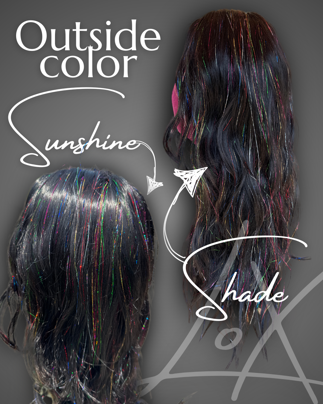 Color: Ebony with all the sparkle of rainbow tinsel throughout.