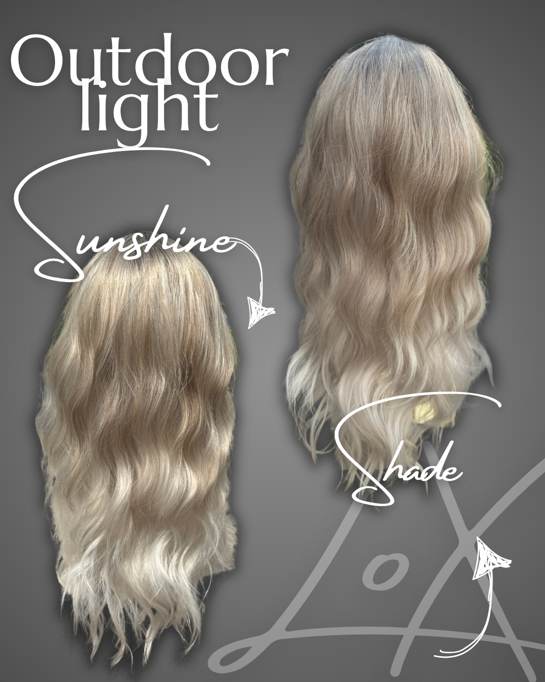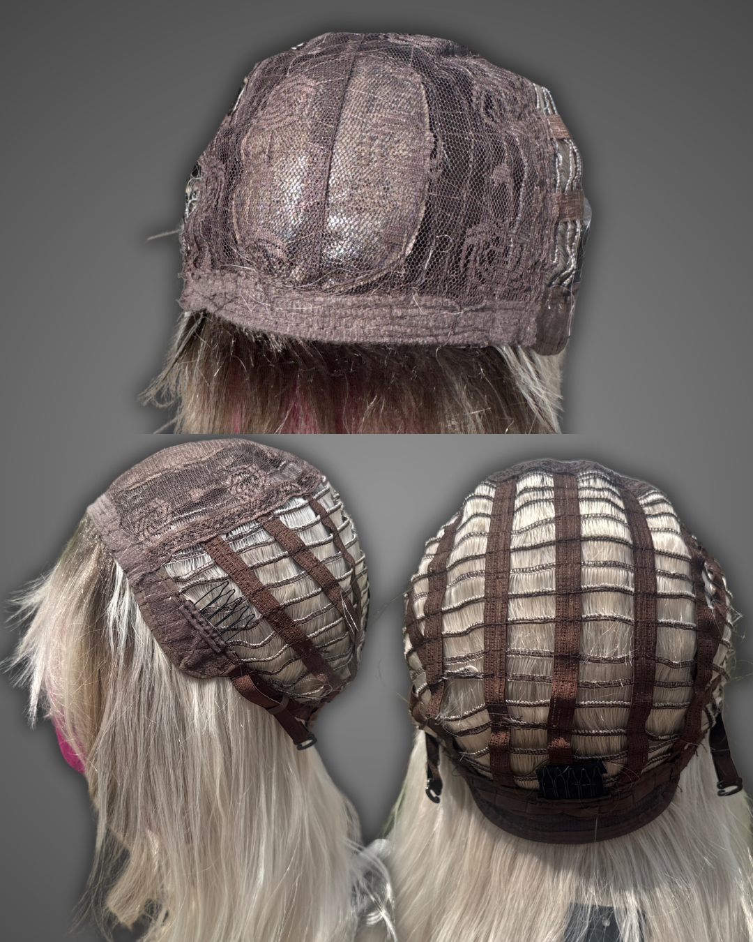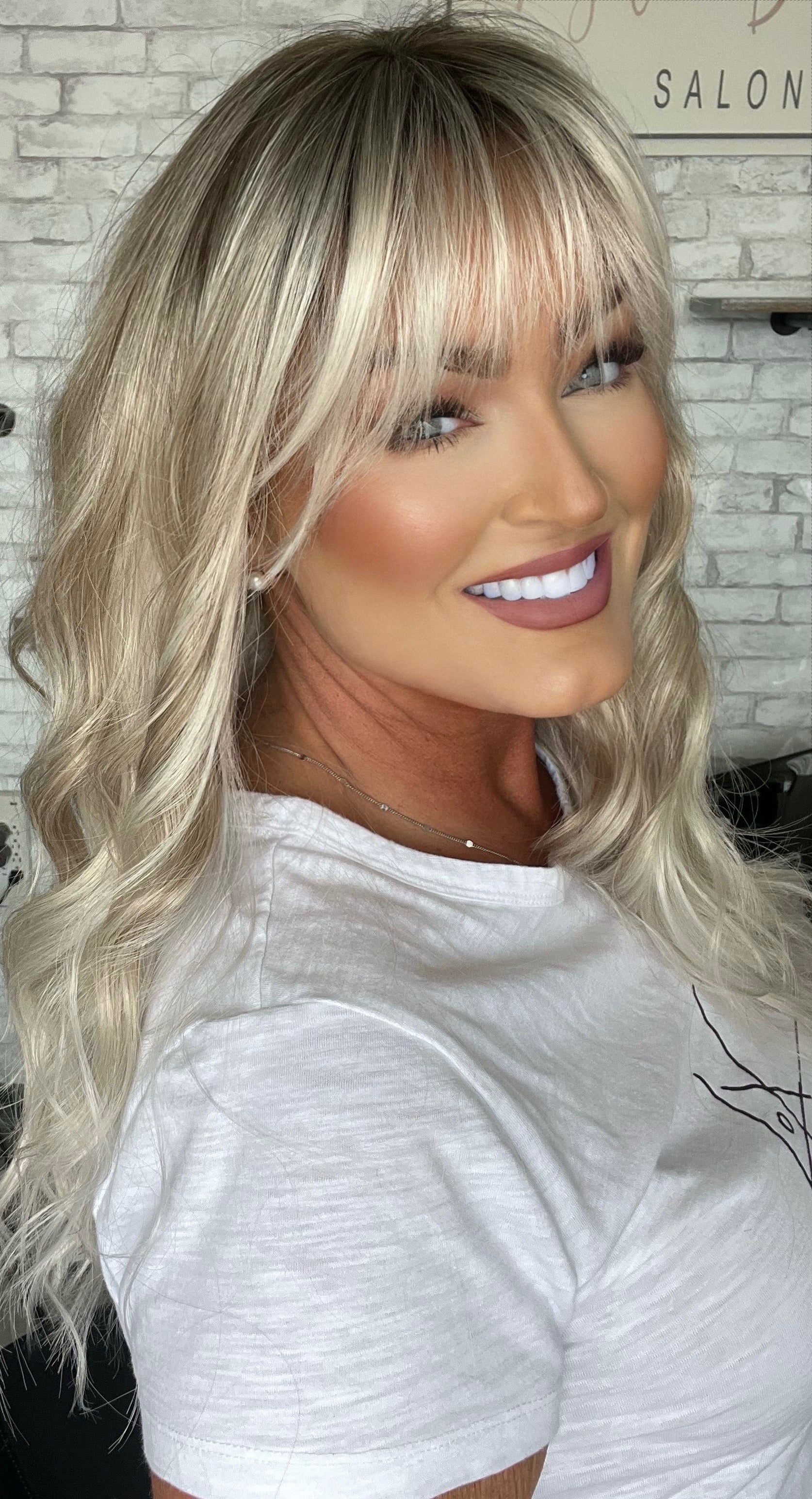 Hard front with middle scalp part. 14 inch nape to ends. Soft water waves with bangs.