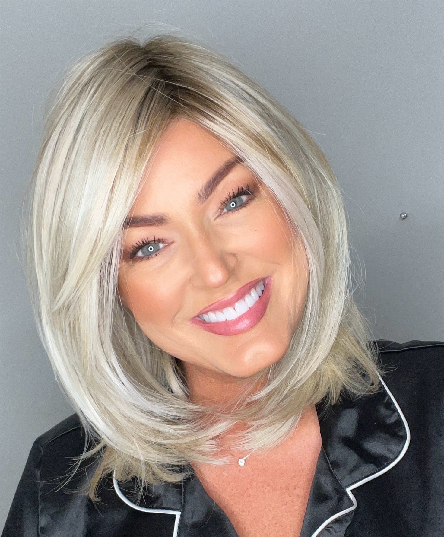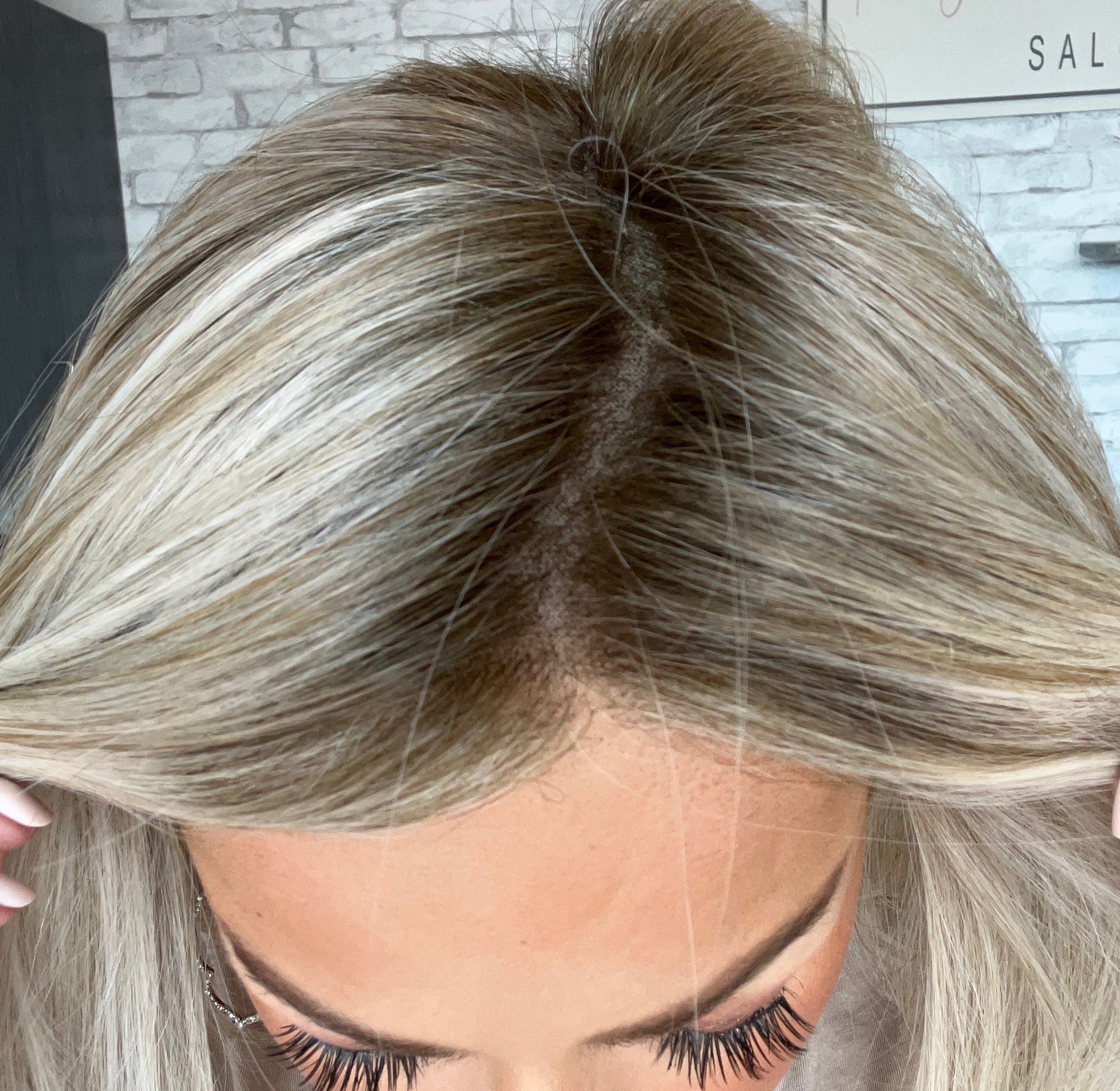 Natural blonde with thin platinum highlights, taupe blonde lowlights, and a ash brunette root