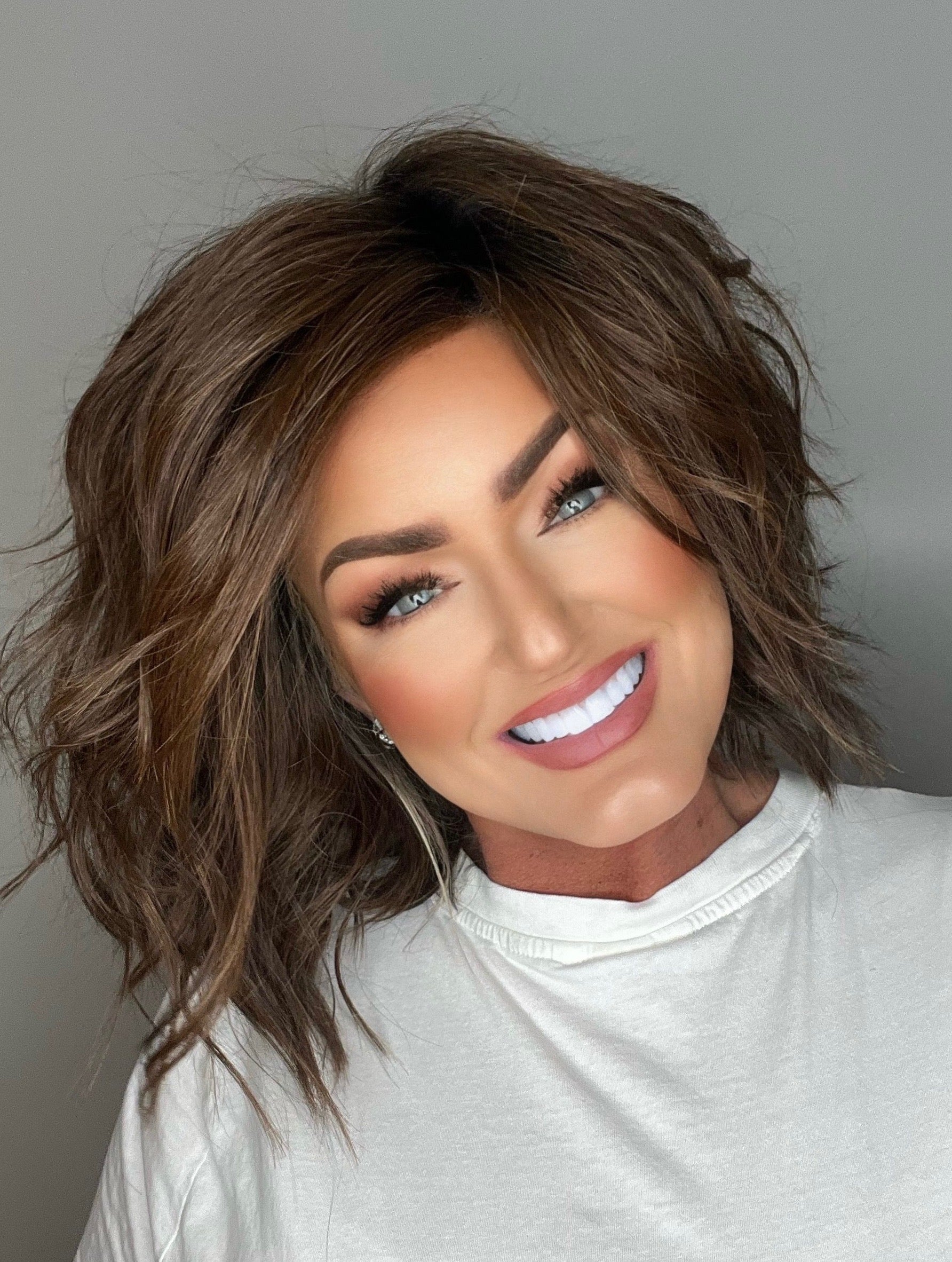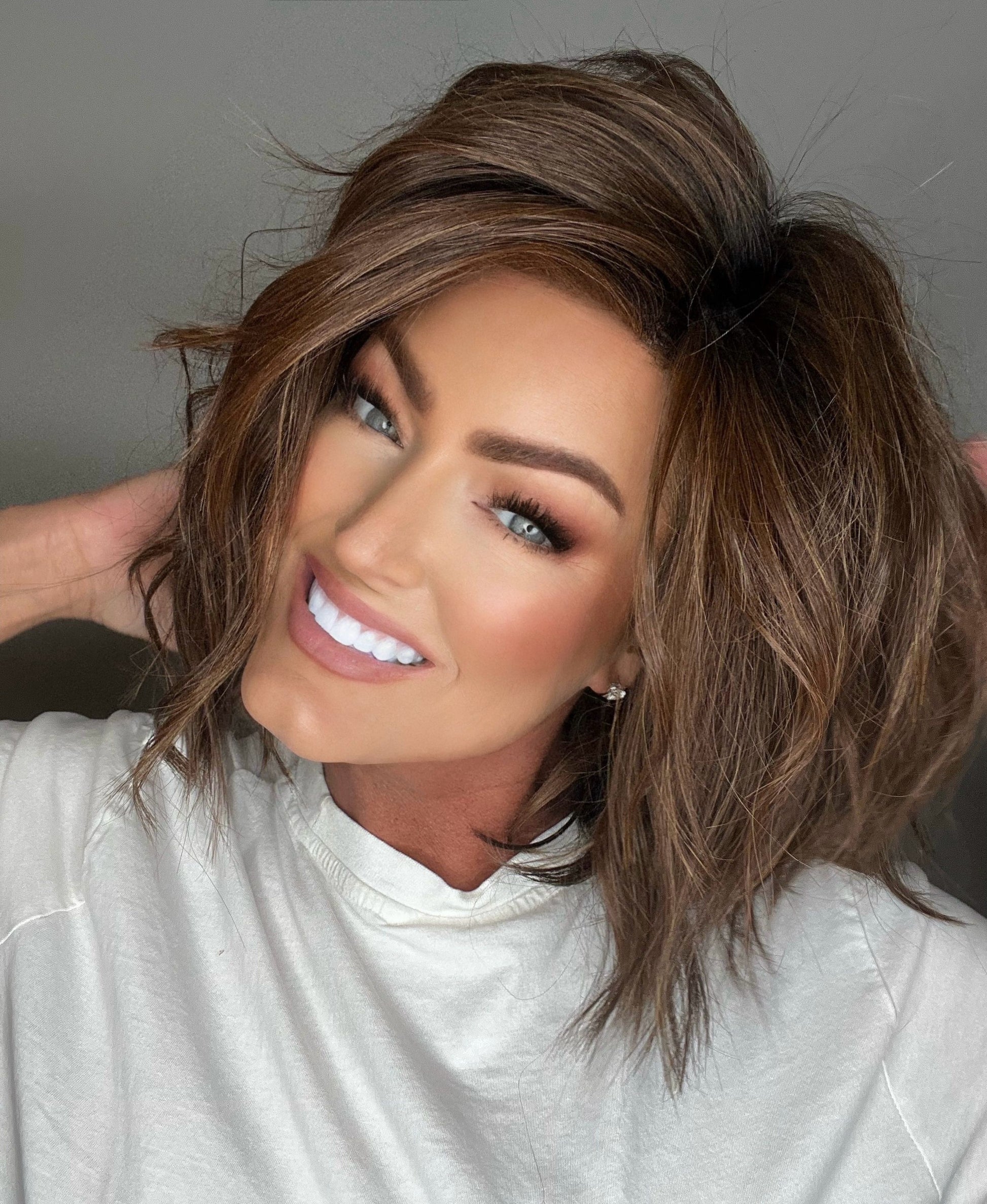 Experience a perfected look with our Bates wig in our LoxStar Collection, styled by expert stylist Angela Emmons. Bates is a beautiful mix of medium and chocolate brunette with a darker root, average size cap and120% density with and is left side parting. This open wefted cap has a comb at the nape of the neck for added security.