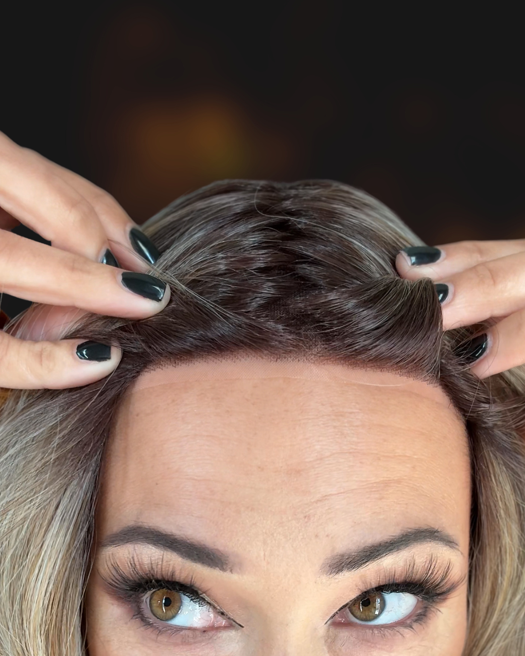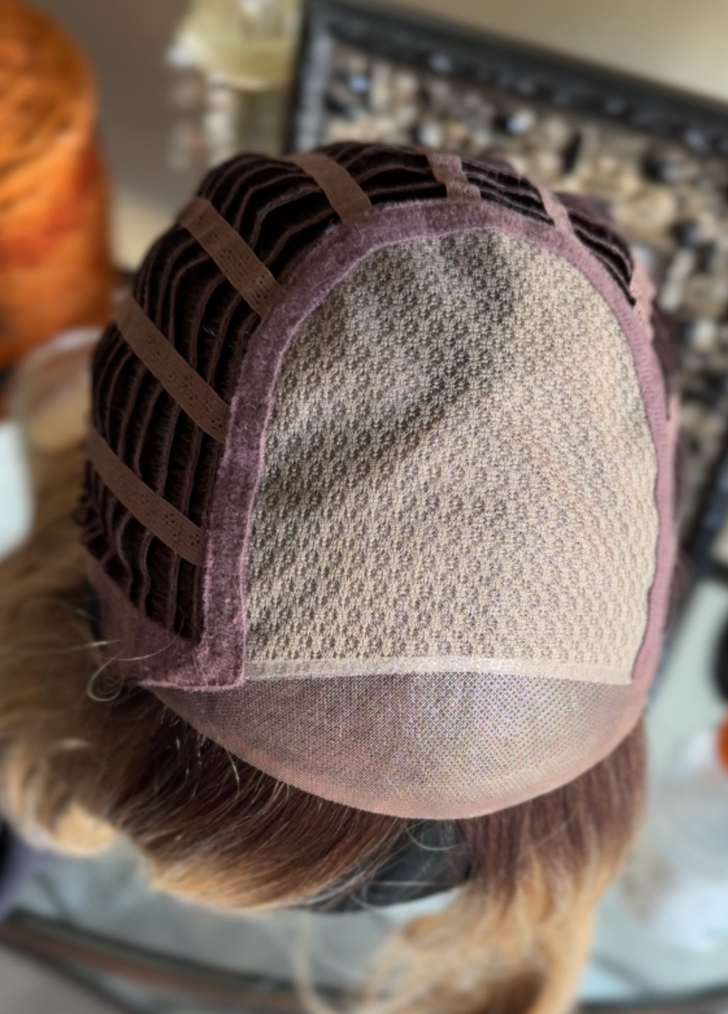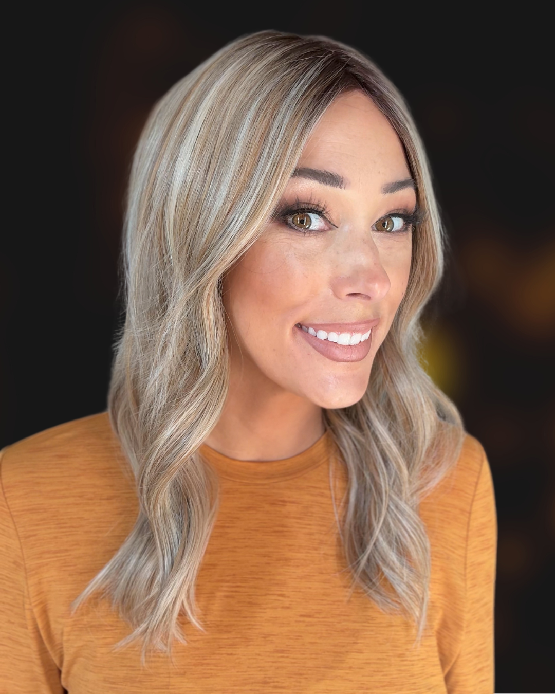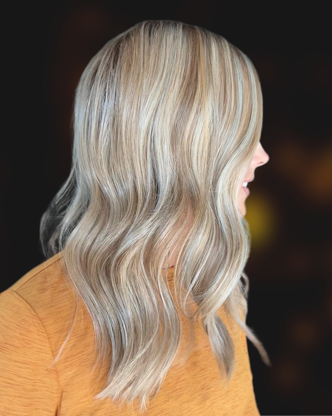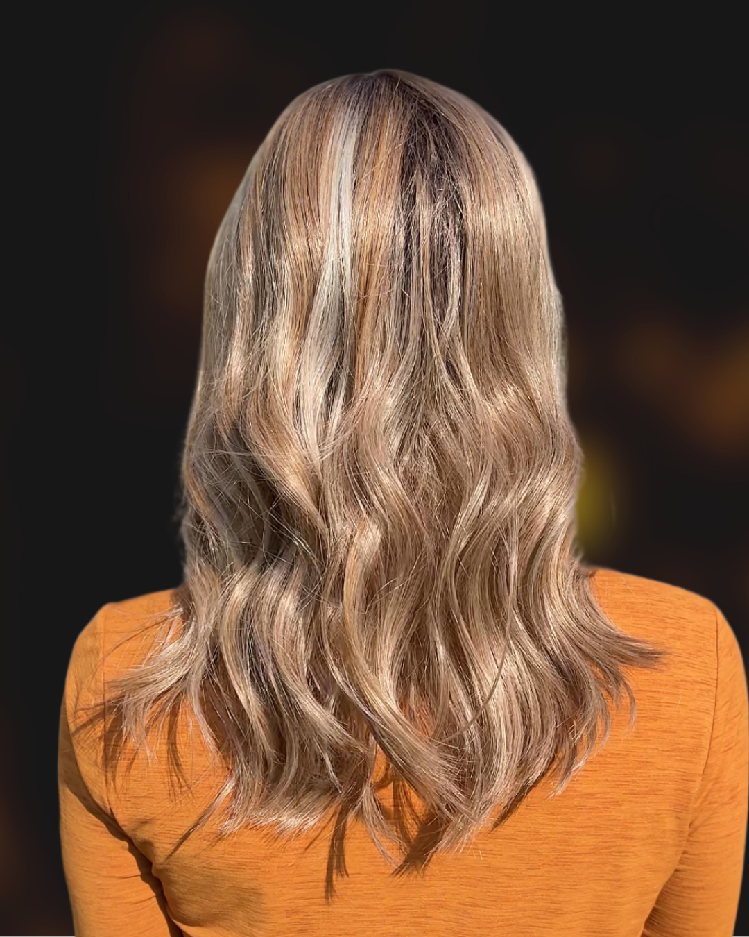 Dark Blonde with light blonde highlights. Ash Brunette root