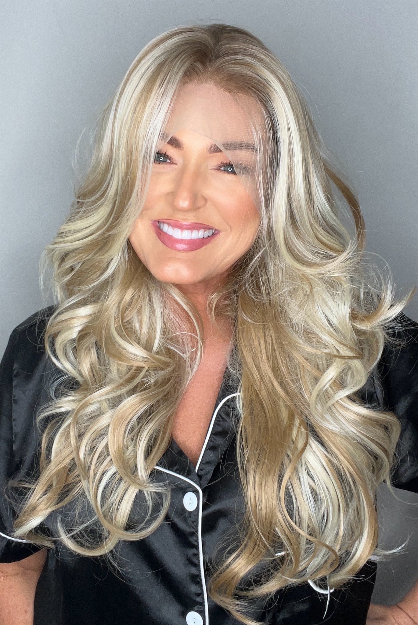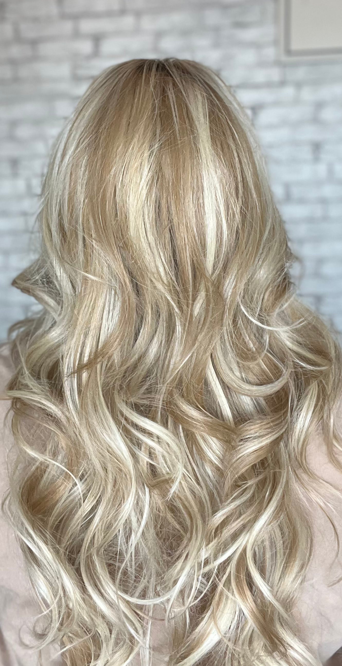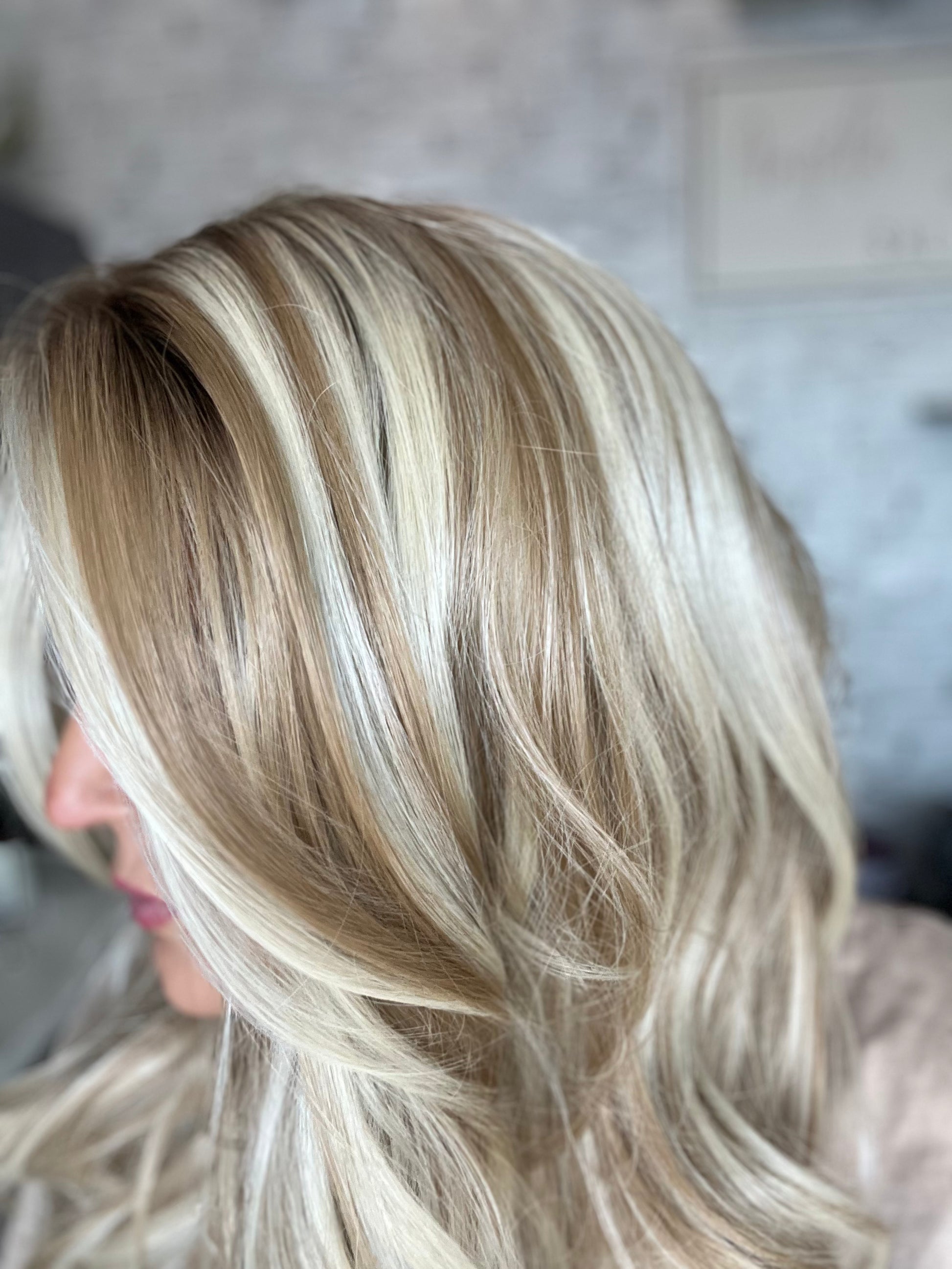 Natural blonde with highlights, butterscotch lowlights, and a brunette root