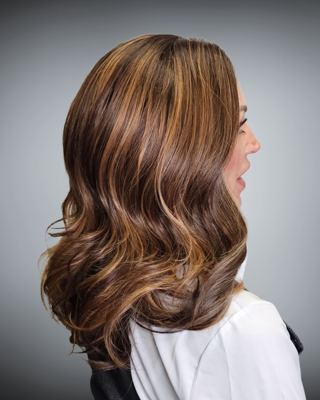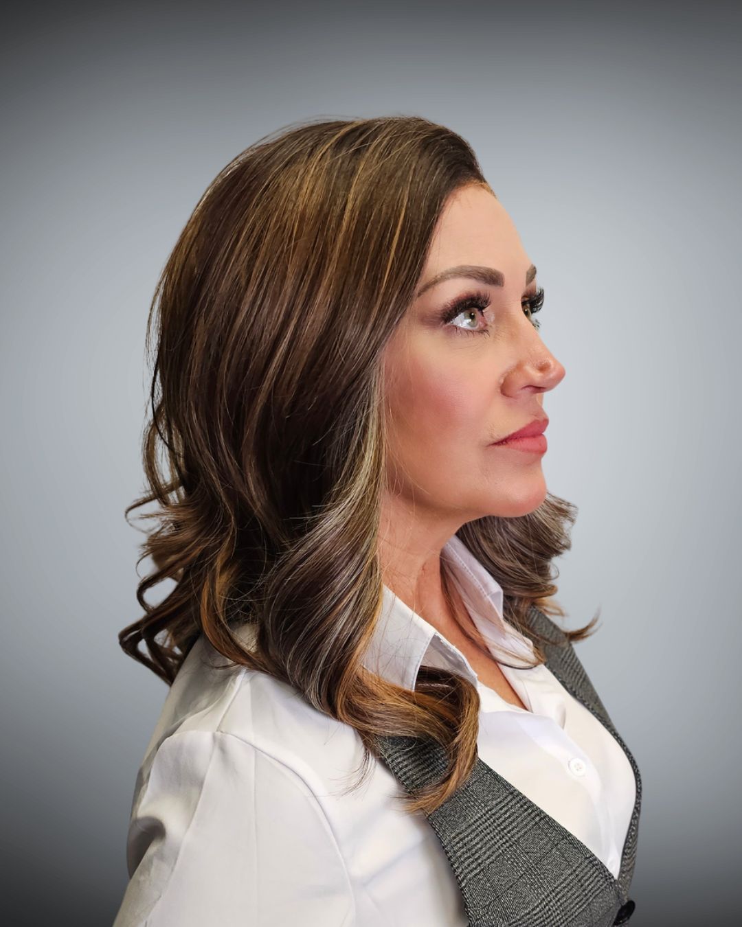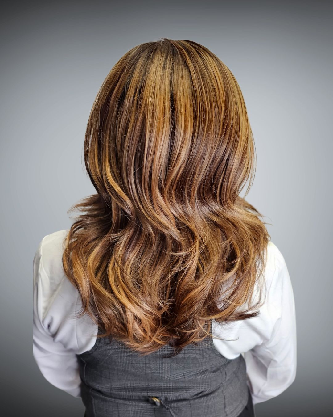 Experience a flawless look with our Dublin wig, customized by renowned stylist Angela Emmons. This is a long shag hairstyle featuring a level 6 root with beige copper balayage and a subtle peek-a-boo ashy platinum blonde streak in the front.