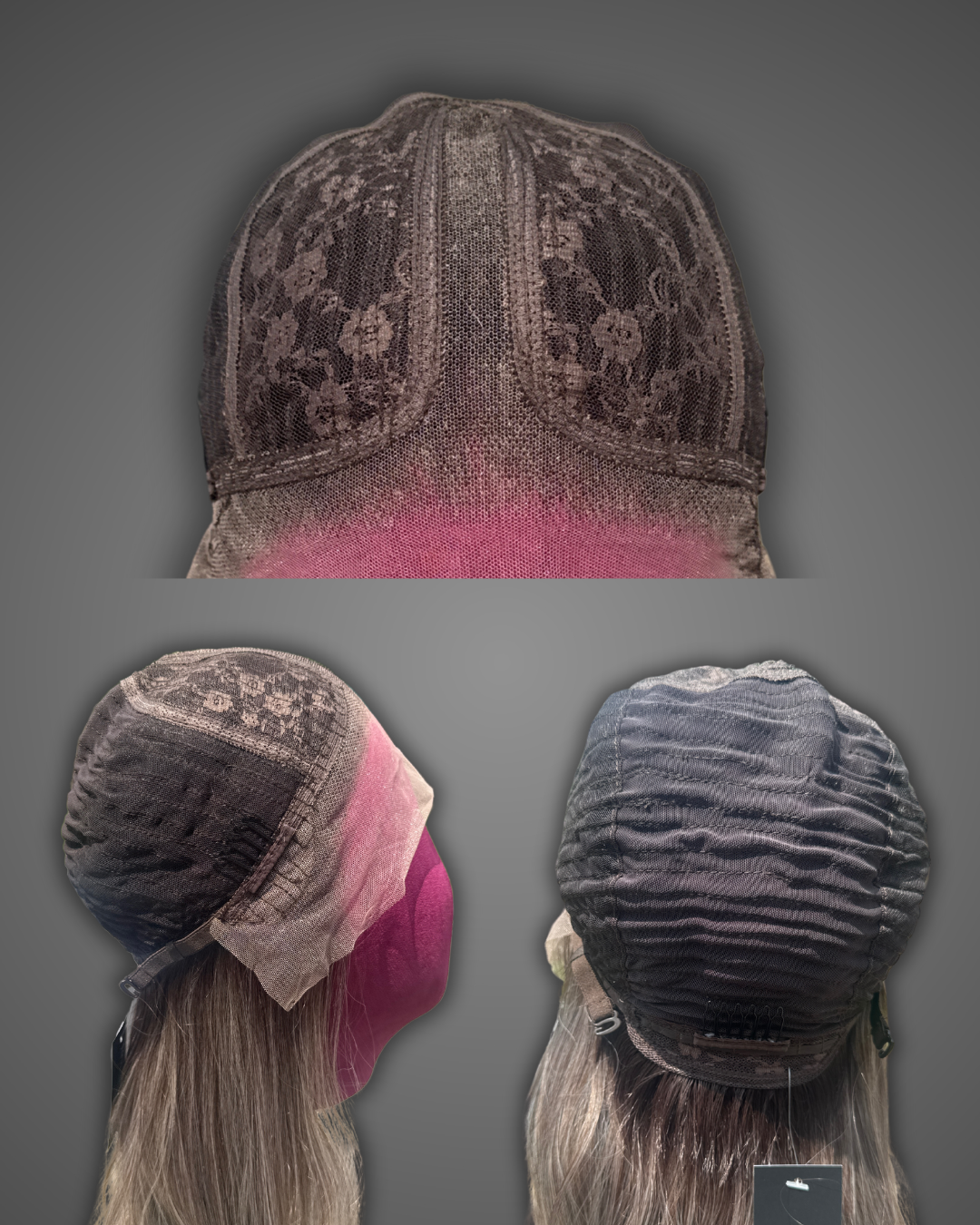 18 inch nape to ends lace front center part with 3 combs and adjustable straps. Soft body waves with curtain band and layers