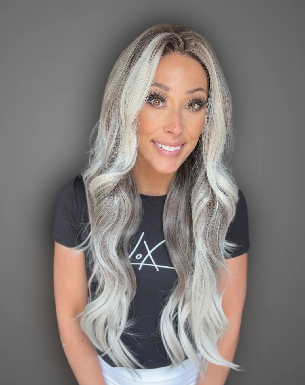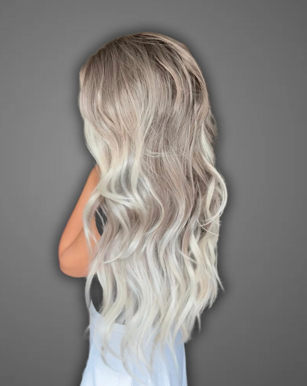 Color: ashy med/dark root and is a balayage with ashy platinum highlights and a money piece. This is a gray ashy hair dream