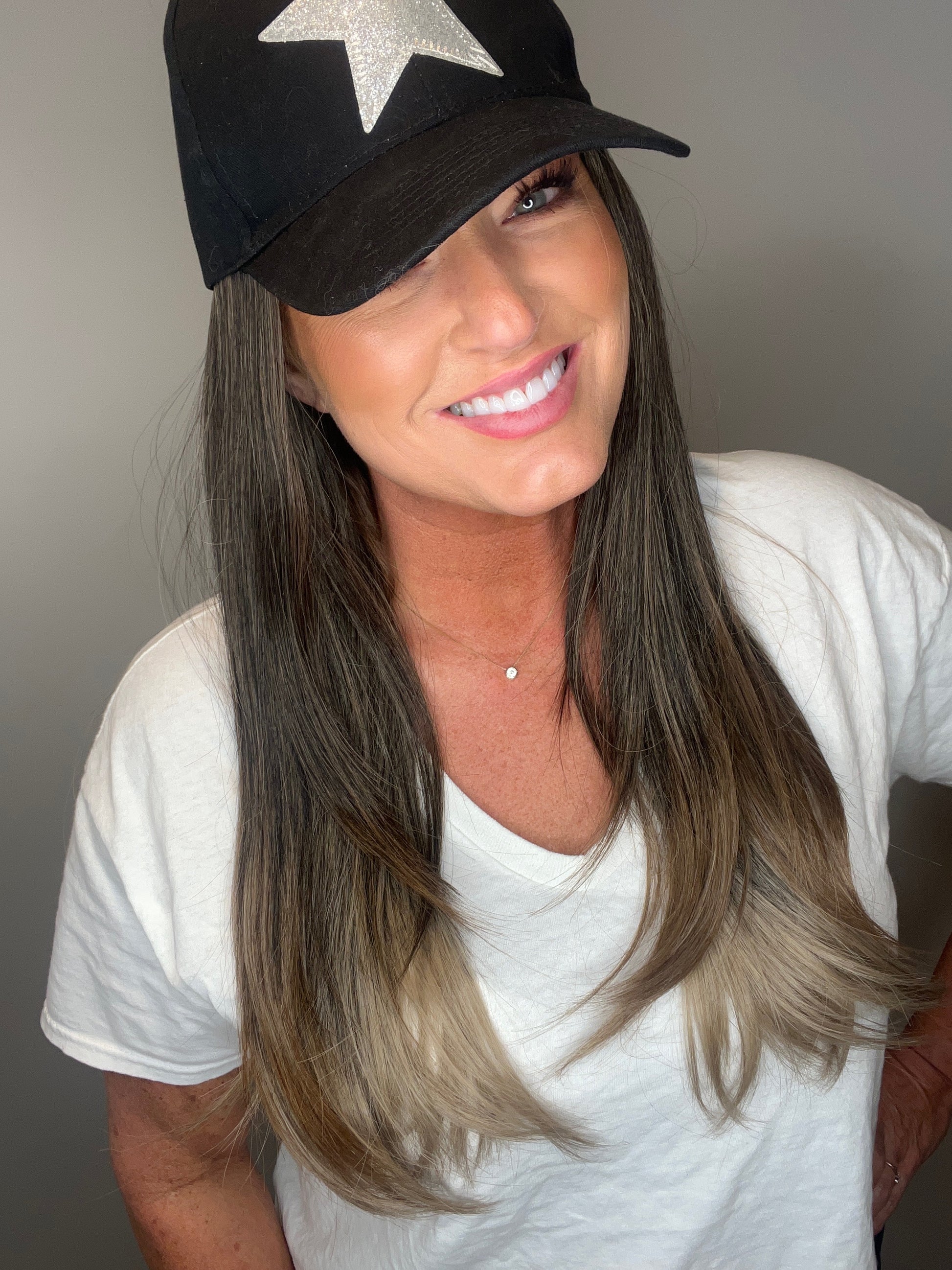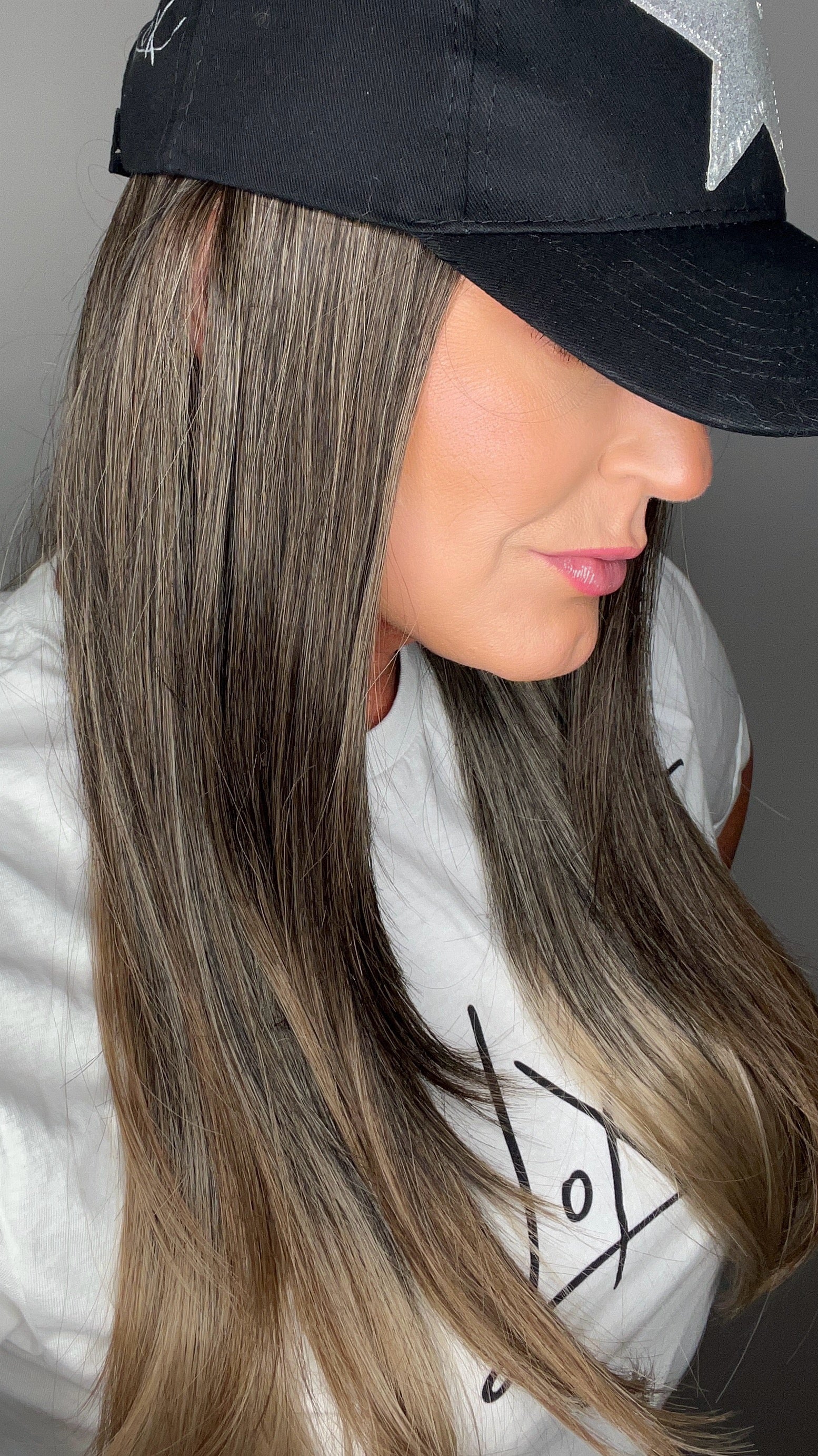 Experience an effortless look with our Topless Sandy Beach Long Wig. This wig is designed to be worn with a hat or scarf covering. Sandy Beach long is a beautiful Brunette with blonde highlights, average size open wefted cap for superior ventilation and140% density. This has a 3 combs for added security. Use your own hat, hats are not provided.